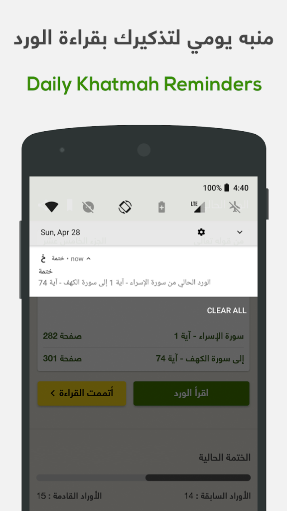 يقترح لك التطبيق الوقت الأنسب لقراءة وردك اليومي مع تذكير لطيف يساعدك على الالتزام.
