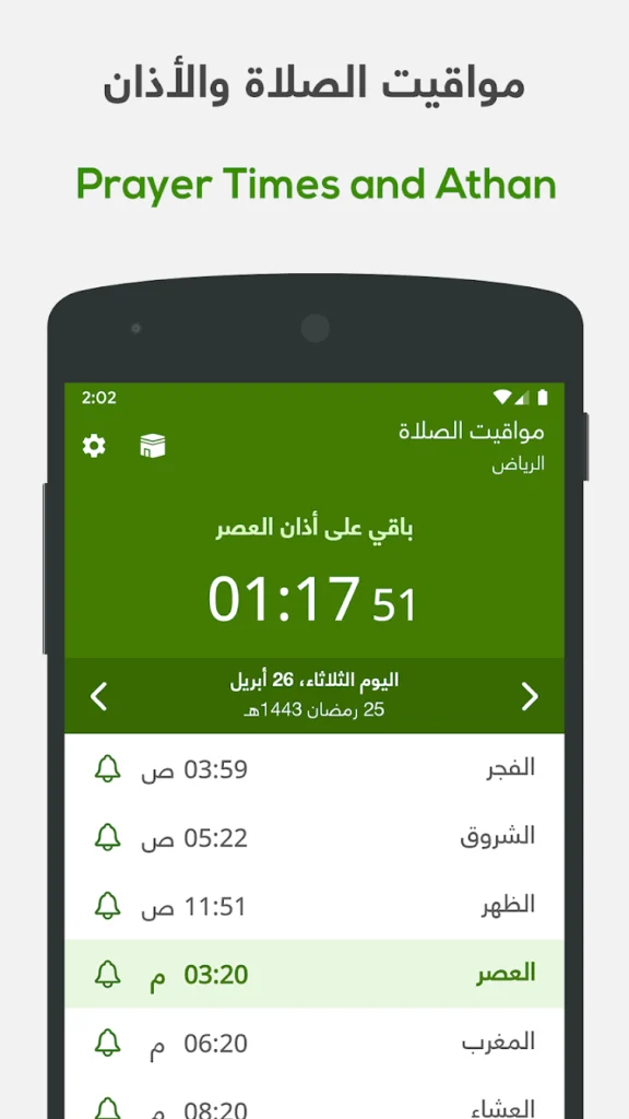 تنبيهات دقيقة لمواقيت الصلاة حسب موقعك، مع تنبيهات الأذان وقبل الأذان.