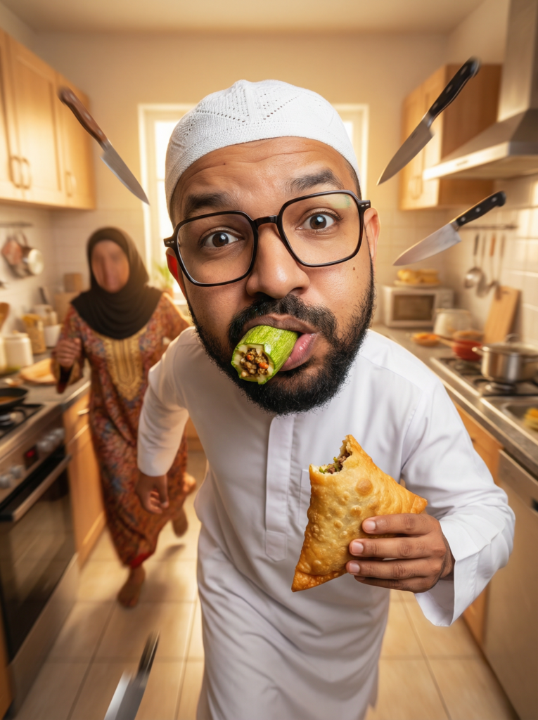 Warm Ramadan kitchen lighting, cinematic, soft motion blur, controlled chaos, ultra-high quality, photorealistic.
