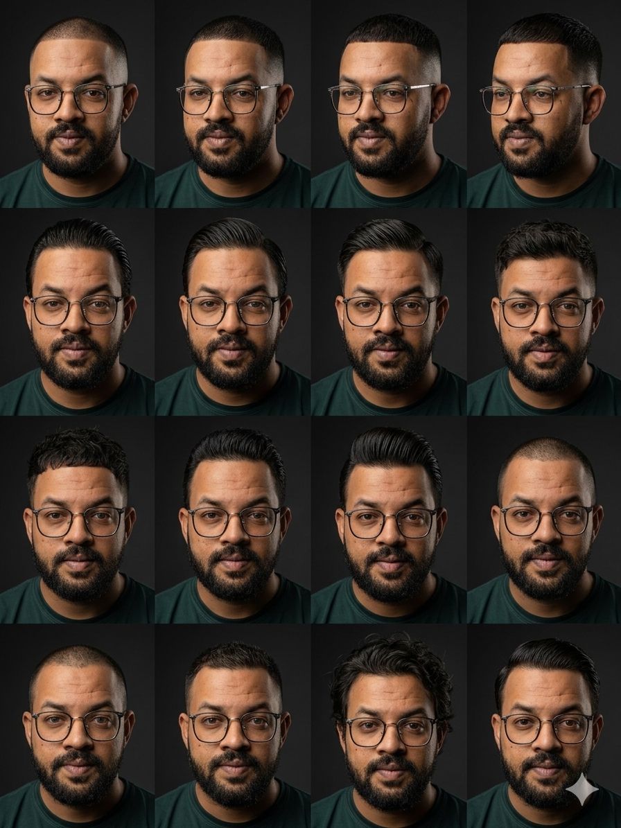 Create a high-resolution cinematic portrait collage of the same man showing 12 different men’s hairstyles. Keep the exact same face, facial features, proportions, skin tone, and identity with zero modification. Only change the hairstyle in each variation. The hairstyles must be modern, stylish, masculine, and realistic – not exaggerated or unusual. Include styles like: fade cut, low fade, mid fade, taper fade, slick back, side part, textured crop, pompadour, buzz cut, crew cut, messy medium length, and classic comb over. Arrange them in a clean 3×4 grid layout. Professional barbershop style. Cinematic lighting, soft shadows, dramatic contrast, high detail, sharp focus, 4K quality, dark neutral background. Maintain natural hair texture and realistic blending with the scalp